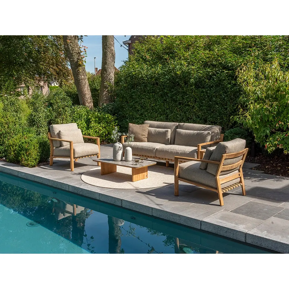 De 4 Seasons Outdoor Lucas Loungeset bestaat uit een comfortabele bank, twee stijlvolle stoelen en een salontafel. De stoelen en bank zijn gemaakt van teakhout en webbing. Het onderstel van de tafel is gemaakt van teakhout en het tafelblad is gemaakt van keramiek. De set wordt inclusief kussens geleverd. In totaal biedt de loungeset comfortabele zitplaatsen voor vier personen. Perfect om heerlijk te ontspannen in eigen tuin.