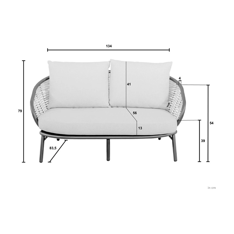 De sofa loungeset bestaat uit een driezitsbank, tweezitsbank, een fauteuil en 2 salontafels.