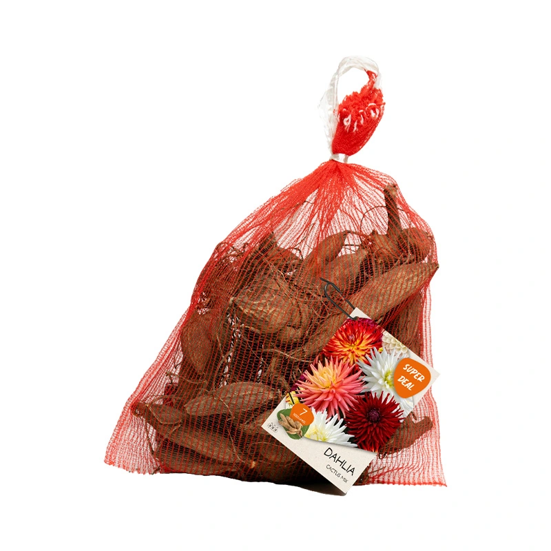 Netverpakking met 7 Dahlia seedling cactus bloembollen in een kleurrijke mix. Perfect voor een levendige tuin vol prachtige bloemen.