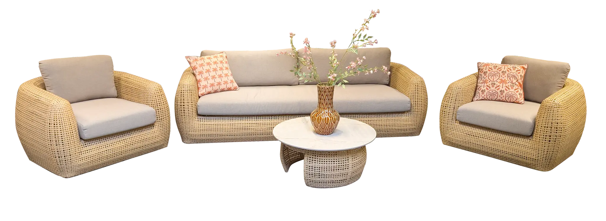 De set is vervaardigd uit hoogwaardig wicker, wat niet alleen zorgt voor een stijlvolle, handgevlochten look, maar ook voor duurzaamheid en weerbestendigheid. De zachte, neutrale kussens bieden optimaal zitcomfort en sluiten naadloos aan bij de warme tinten van het frame.