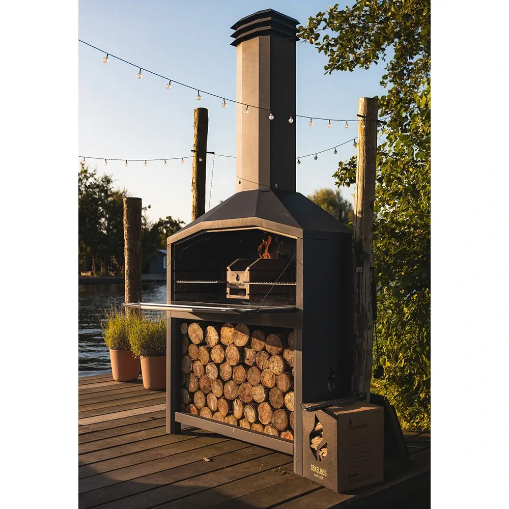 De braaimaster wordt standaard geleverd inclusief schoorsteen, staander voor houtopslag, geïntegreerde trekklap, kolenmaker, kolenpan, RVS grillrooster, RVS pook en RVS haak.