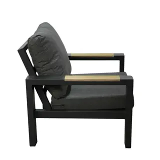 Het frame van de tuimeubelen zijn gemaakt van aluminium en de armleuningen van teak . De zitmeubelen worden geleverd inclusief stevige zit- en rugkussens in een donkergrijze kleur.
