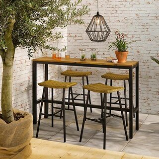 De meubelen hebben een stevig ijzeren frame voorzien van een beschermende poedercoating. Het tafelblad is gemaakt van acacia hout en de stoelzitting van wicker.