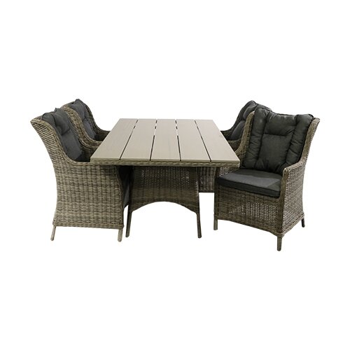 De tuinmeubelen hebben een stevig aluminium frame als basis en zijn omwikkeld met kunststof wicker vlechtwerk. Het tafelblad is gemaakt van polywood. Dit heeft de uitstraling van hout maar is gemaakt van duurzaam kunststof en blijft daarom veel langer mooi.