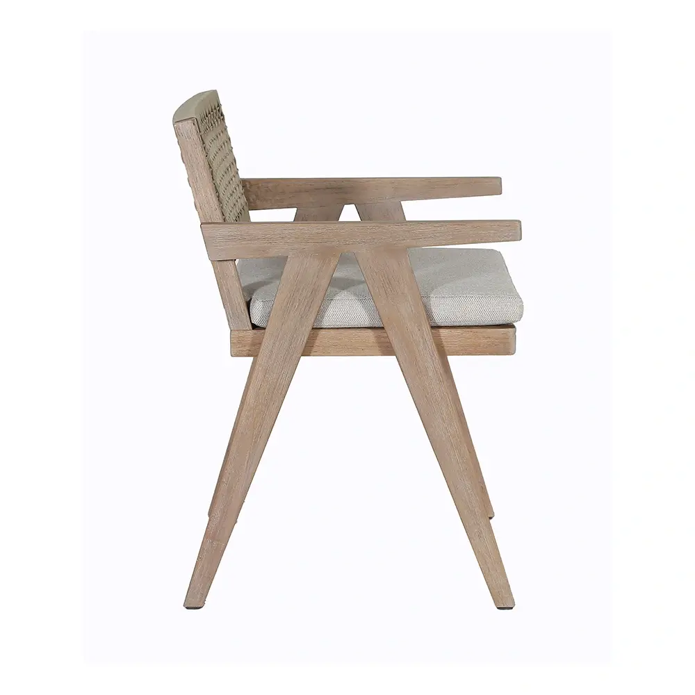 De tuinstoel heeft een frame gemaakt van acaciahout met een rugleuning van rope. Bij de stoel wordt een stevig zitkussen geleverd.