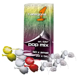 Pop Mix, een doosje met 70 stuks knalerwten. Deze knalerwten zijn onderverdeeld in twee type; 50 stuks van de originele maat knalerwten, en 20 stuks van de grote gekleurde maat knalerwten.