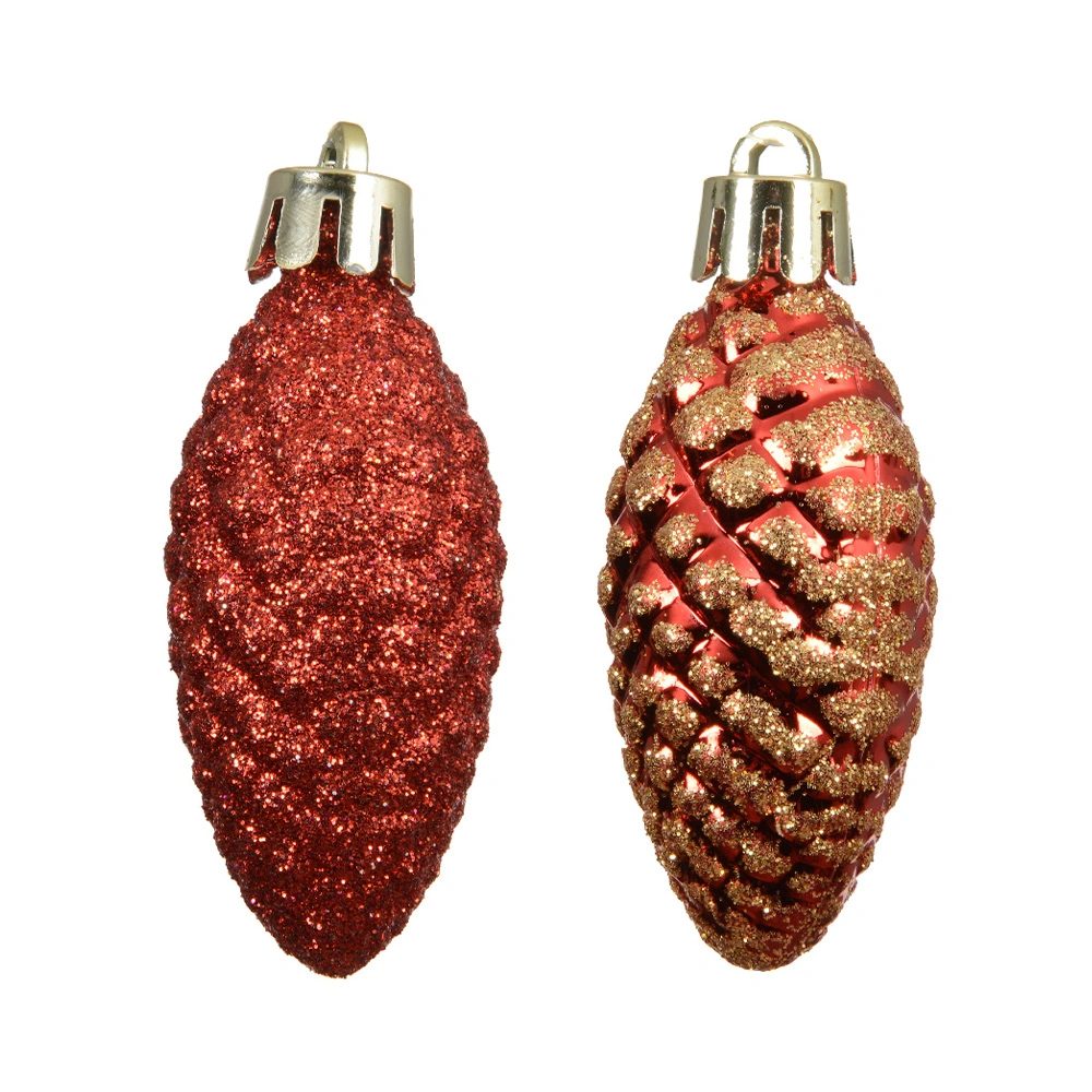 De dennenappels hebben een rode kleur en hebben een glinsterend effect door de glitters. Een verpakking bestaat uit 12 dennenappels.