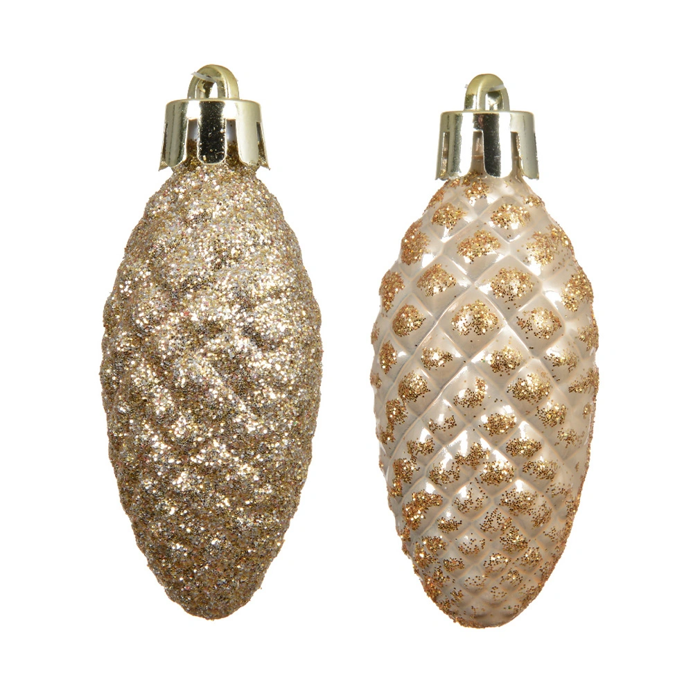 De dennenappels hebben een beige kleur en hebben een glinsterend effect door de glitters. Een verpakking bestaat uit 12 dennenappels.