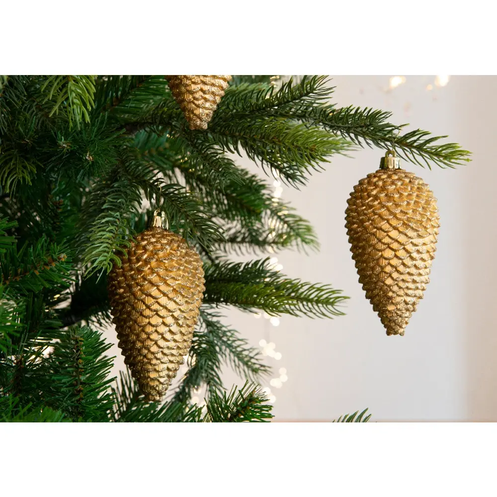Met Dennenappels 4 st. - Licht Goud laat je de kerstboom stralen! Deze onbreekbare dennenappels hang je gemakkelijk op aan de draadlinten die aan de dennenappels zijn bevestigd. Deze plastic dennenappels hebben een luxe uitstraling en zijn toch veilig voor kinderen en huisdieren.
