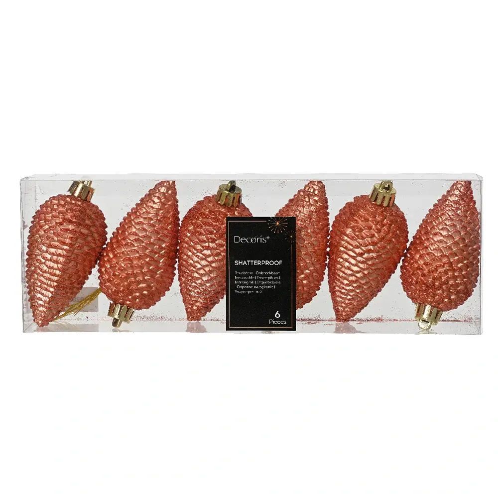 De dennenappels hebben een oranje kleur en hebben een glinsterend effect. Een verpakking bestaat uit 6 dennenappels.