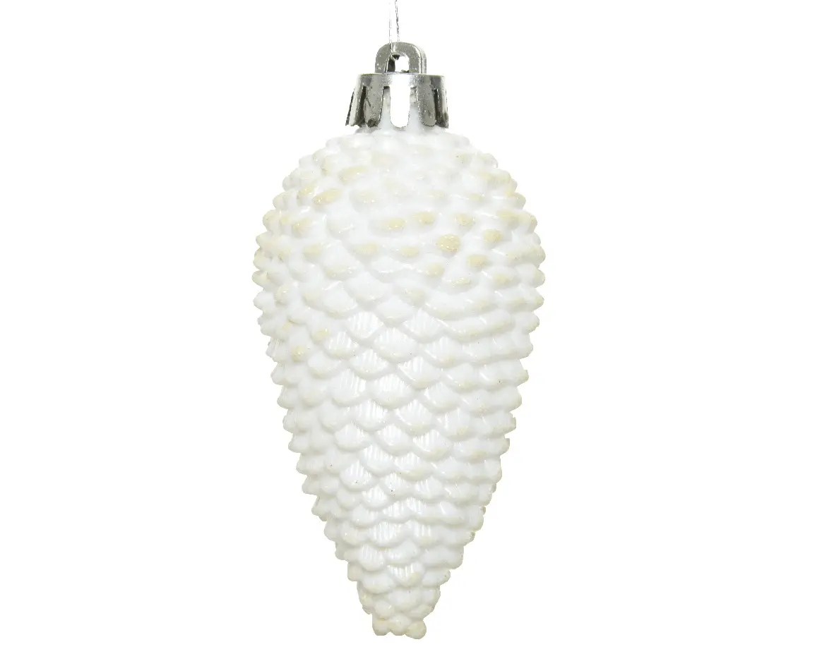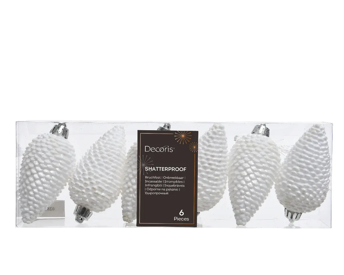 De dennenappels hebben een witte kleur met een glinsterend effect. Een verpakking bestaat uit 6 dennenappels.
