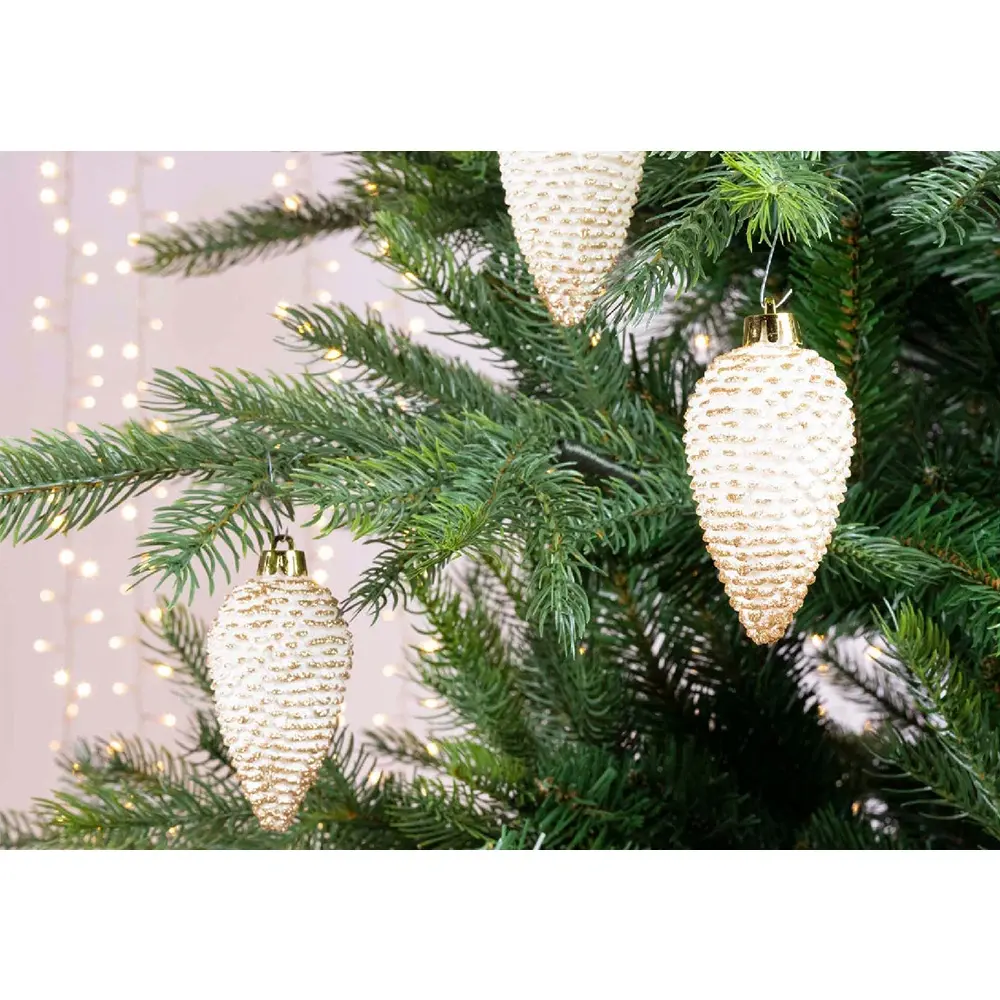 De dennenappels hebben een witte kleur met een glinsterend effect. Een verpakking bestaat uit 6 dennenappels.