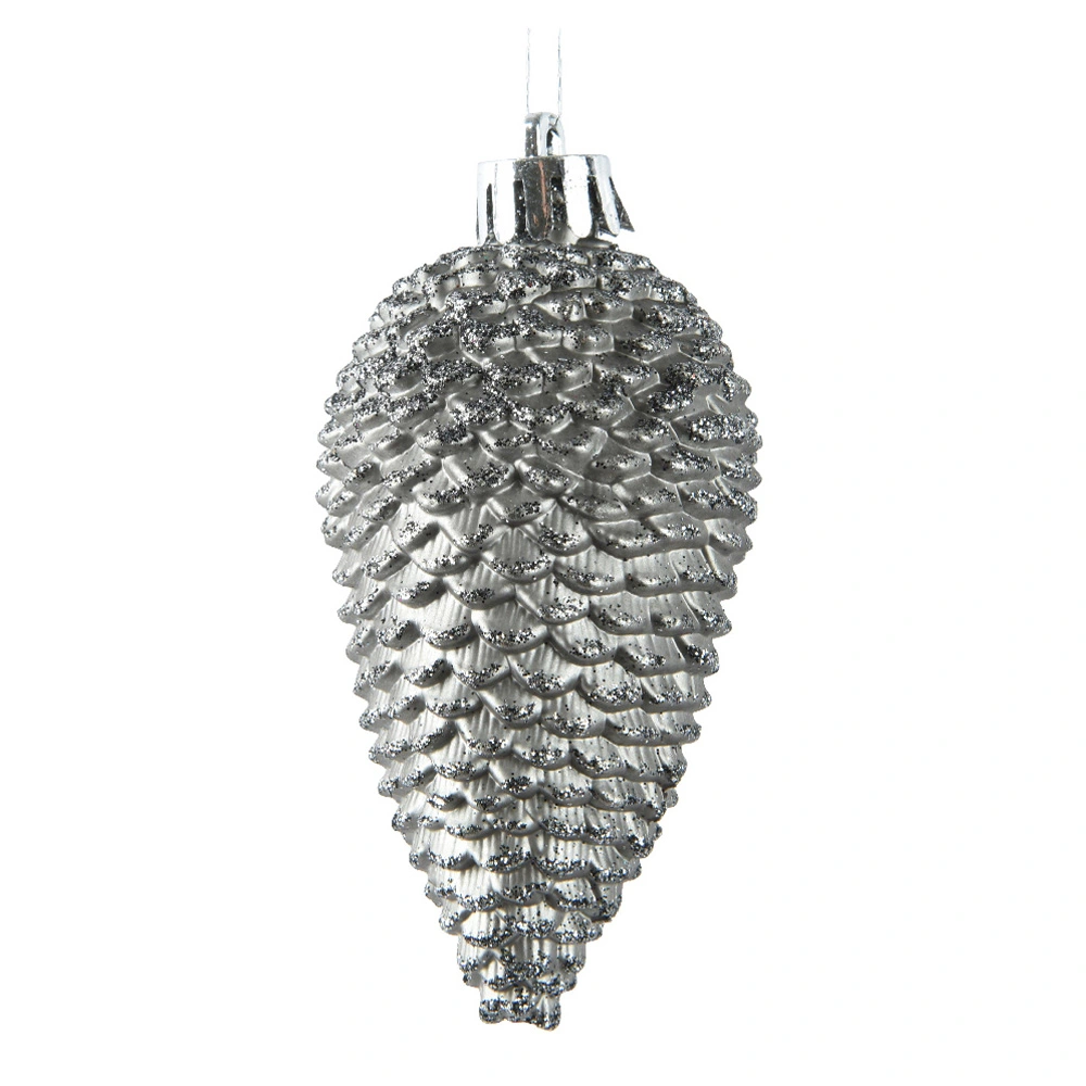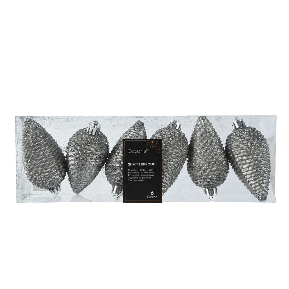 De dennenappels hebben een grijze kleur en hebben een glinsterend effect. Een verpakking bestaat uit 6 dennenappels.