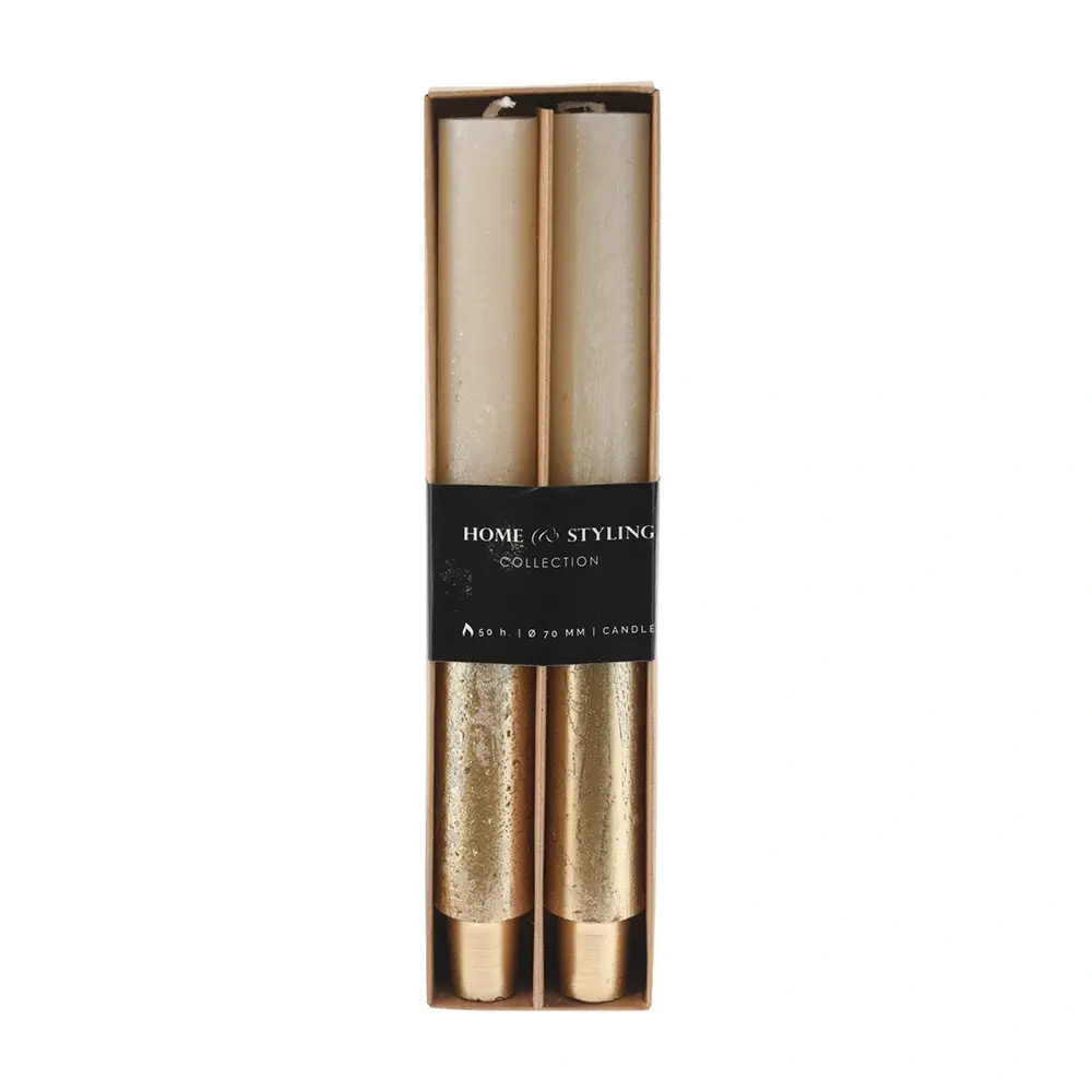 De Dinerkaars Set Crème/Goud - 2 st. is gemaakt van wax en heeft ongeveer 50 branduren.