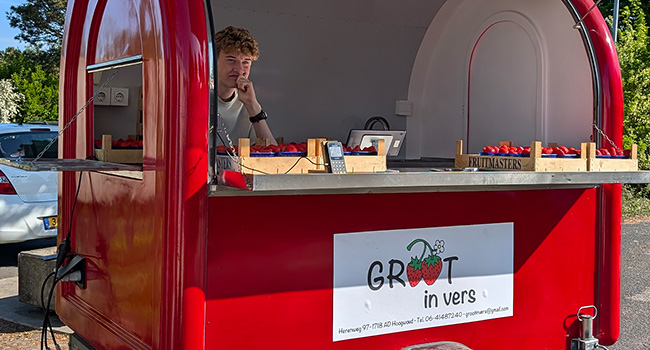 In het voorjaar en de zomer staat op het parkeerterrein, naast de viswagen, een grappig kraampje in de vorm van een aardbei. Hier verkoopt de familie Groot uit Hoogwoud eigen geteelde aardbeien. Reserveer vast een paar euro in je portemonnee, want deze aardbeien moet je proeven, zo lekker!