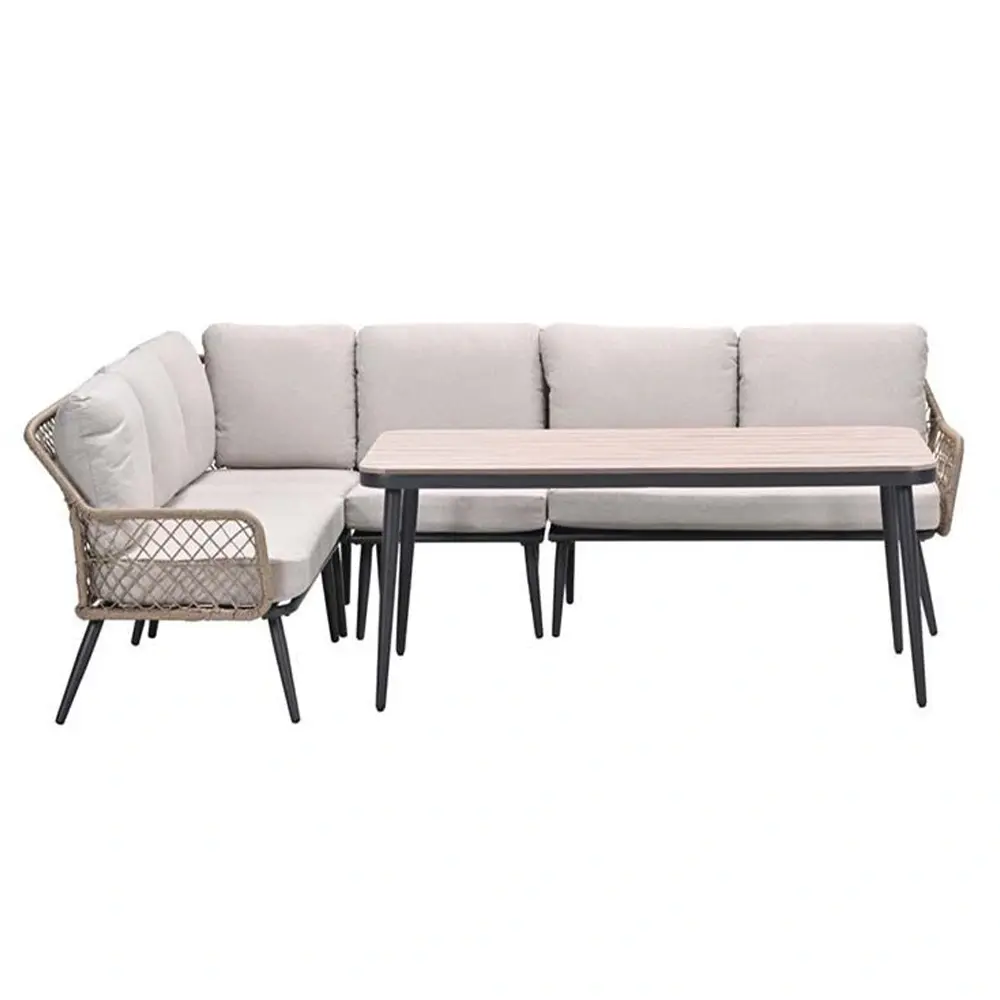 De kussens van de lounge- diningset zijn gemaakt van een waterafstotend polyester materiaal. Dit zachte, comfortabele materiaal zorgt voor een hoog zitcomfort en heeft de eigenschap dat enkele waterdruppels eenvoudig van het kussens af te kloppen zijn. Mocht er slecht weer voorspeld zijn, adviseren wij om de kussens op een warme, droge plaats op te bergen.