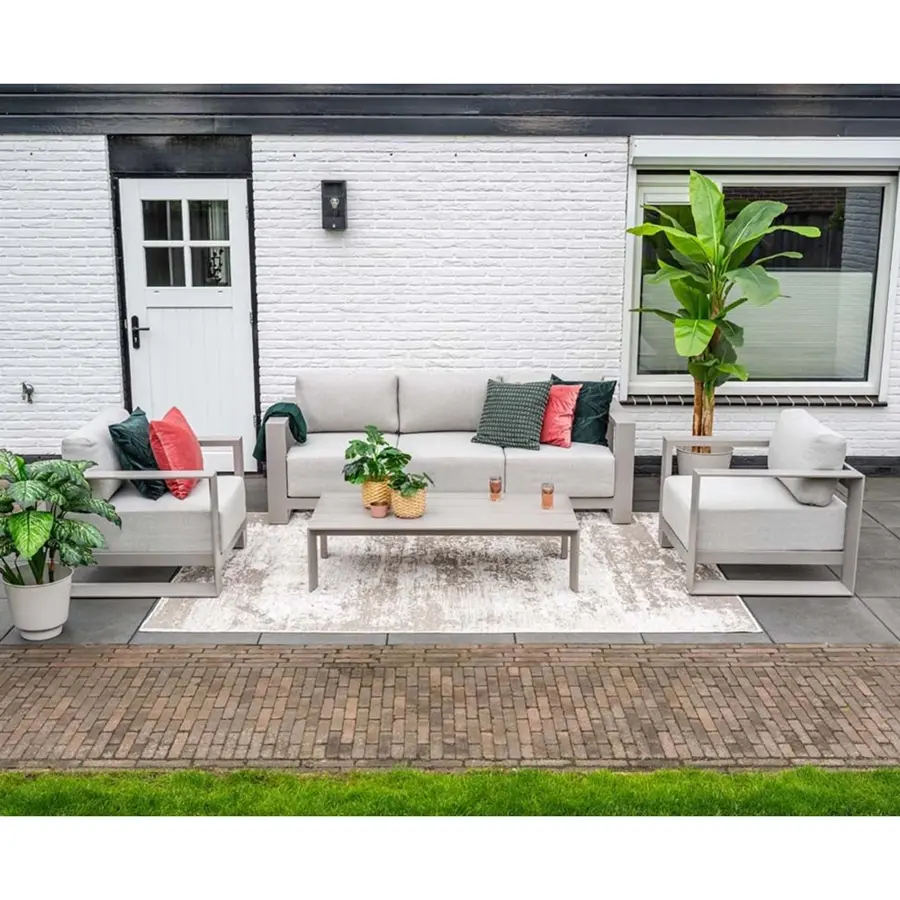 De loungestoel is gemaakt van aluminium met een taupe kleur. Aluminium kan niet roesten en is onderhoudsvriendelijk. De stoel wordt inclusief kussens geleverd en hebben een waterafstotende coating. Een korte regenbui is hierdoor geen probleem. Het water kun je er gewoon weer afkloppen.