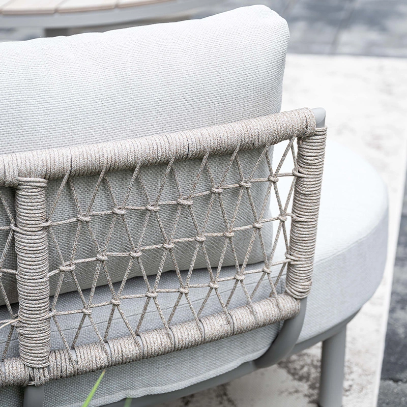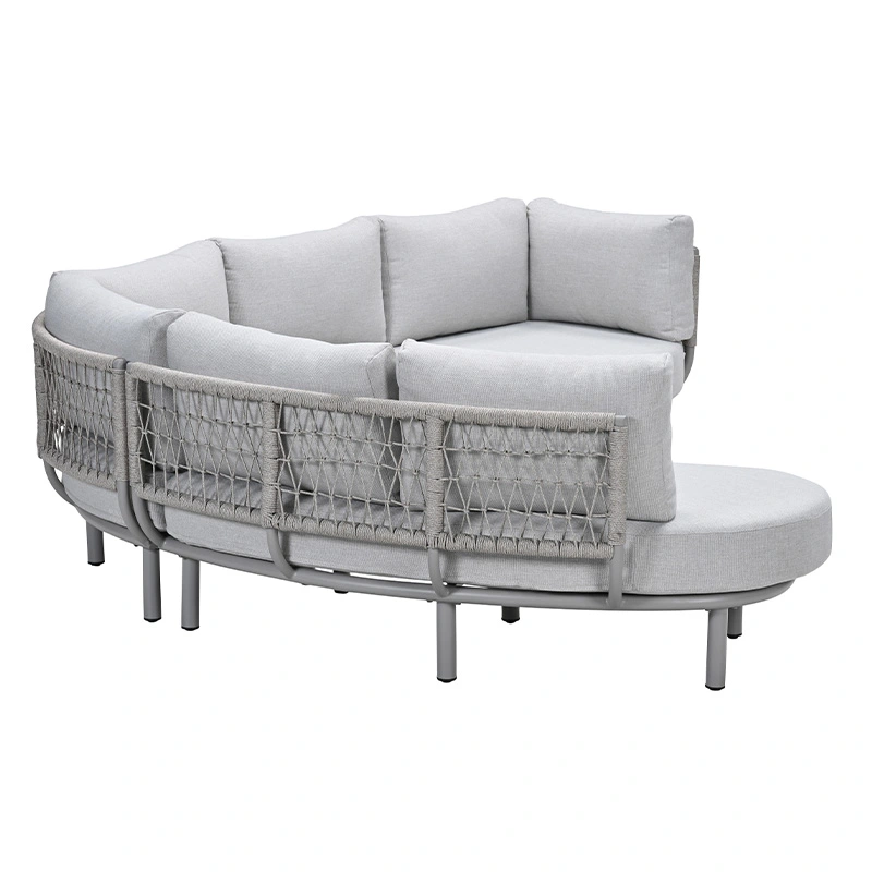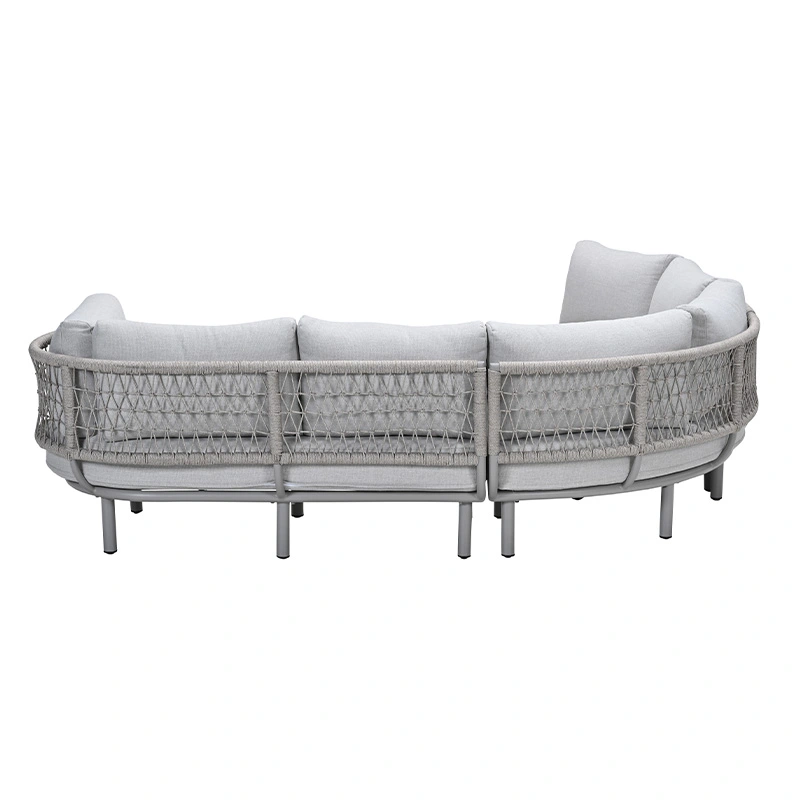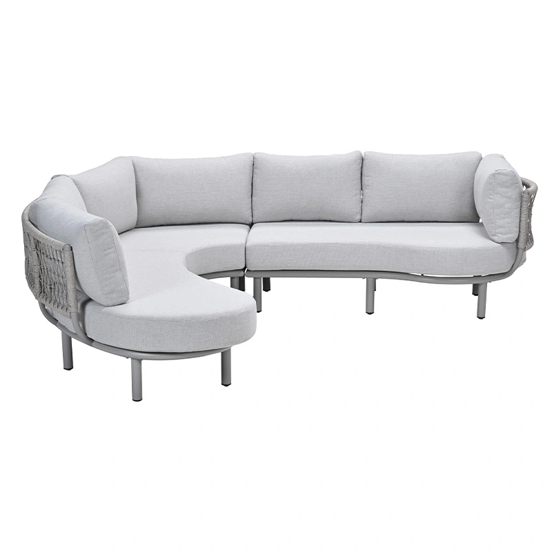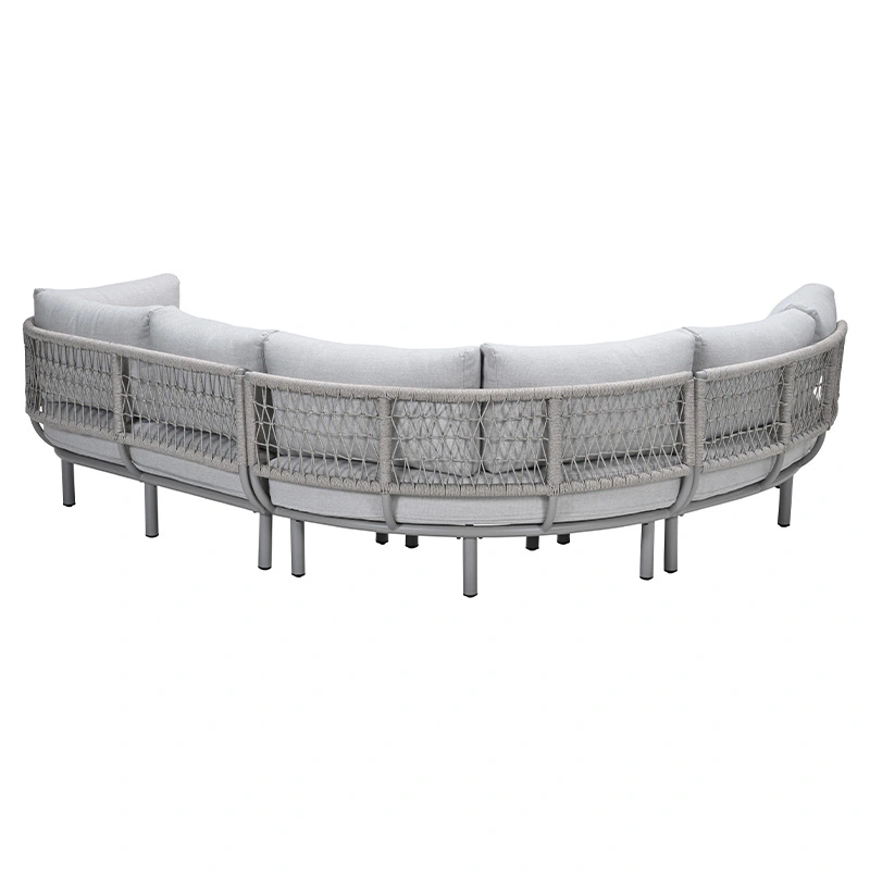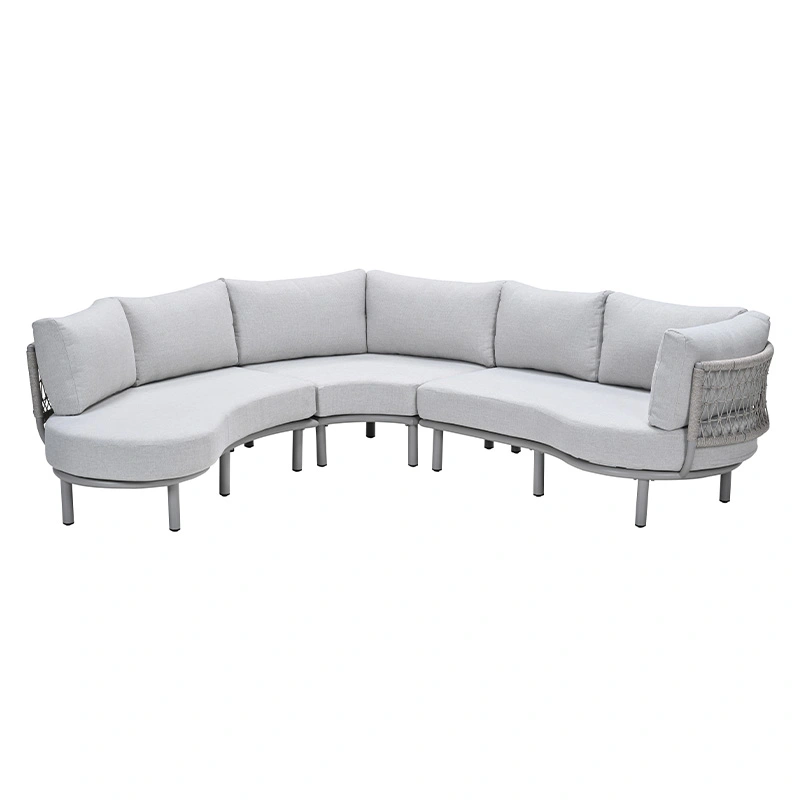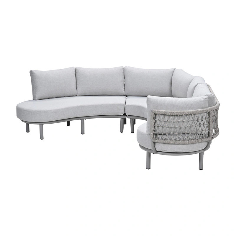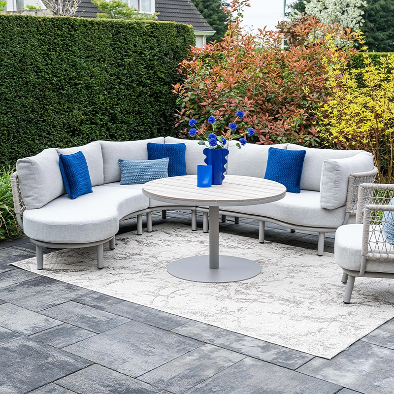De Garden Impressions Matera Loungebank - Valley Sand is een stijlvolle aanvulling voor je tuin. Deze bank combineert stijl, comfort en functionaliteit in één en is perfect voor loungen én dineren. Het halfronde design creëert een gezellige, uitnodigende zithoek, terwijl de trapezehoek optimaal benut kan worden als extra zitplaats. De Matera Loungebank heeft een frame gemaakt van aluminium met een poedercoating, waardoor de bank duurzaam, onderhoudsvriendelijk en weerbestendig is. De rugleuning is afgewerkt met Qualicord rope, wat perfect geschikt is voor buitengebruik.