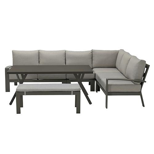 Deze royale aluminium lounge diningset is onderhoudsvriendelijk en zeer duurzaam. Bovendien is er plek voor maar liefst 8 personen op deze set. De 6-delige lounge diningset bestaat uit een grote hoekbank, hoge eettafel en een bakje.