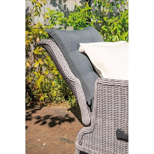 De stoel heeft een lichtgewicht aluminium frame waar omheen met hand gevlochten wicker zit in de kleur cloudy grey. Dit kunststof vlechtdraad is sterk, onderhoudsvriendelijk en bestand tegen diverse weersomstandigheden. De comfortabele kussens in de kleur mystic grey zijn ook inbegrepen en hebben een waterafstotende coating. Geheel waterbestendig zijn de kussens niet.