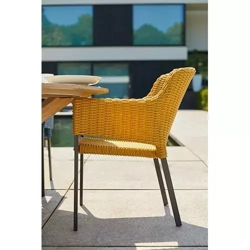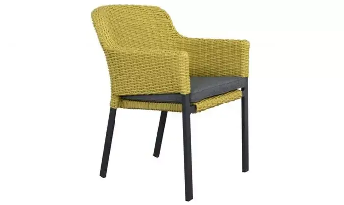 De Cairo Dining Tuinstoel is stapelbaar waardoor u de stoelen gemakkelijk en compact kunt opbergen. Het frame van de stoel is gemaakt van grijs aluminium en de zitting van kunststof wicker vlechtwerk in een fleurige mosterdgele kleur. De gebruikte materialen zijn duurzaam, weerbestendig en onderhoudsvriendelijk.