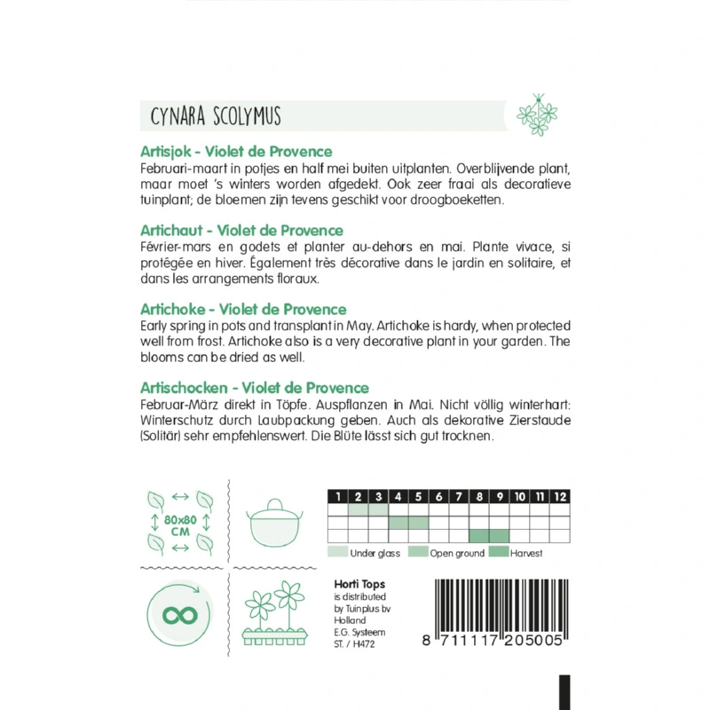 Artisjok Violet de Provance (Cynara cardunculus var. scolymus) is een zeer goed artisjokras. Artisjok kan gegeten worden, de bloemen zijn te gebruiken in droog-boeketten en als decoratieve tuinplant doet de artisjok het uitstekend. Artisjok Violet de Provance is een overblijvende plant maar moet wel in de winter afgedekt worden.