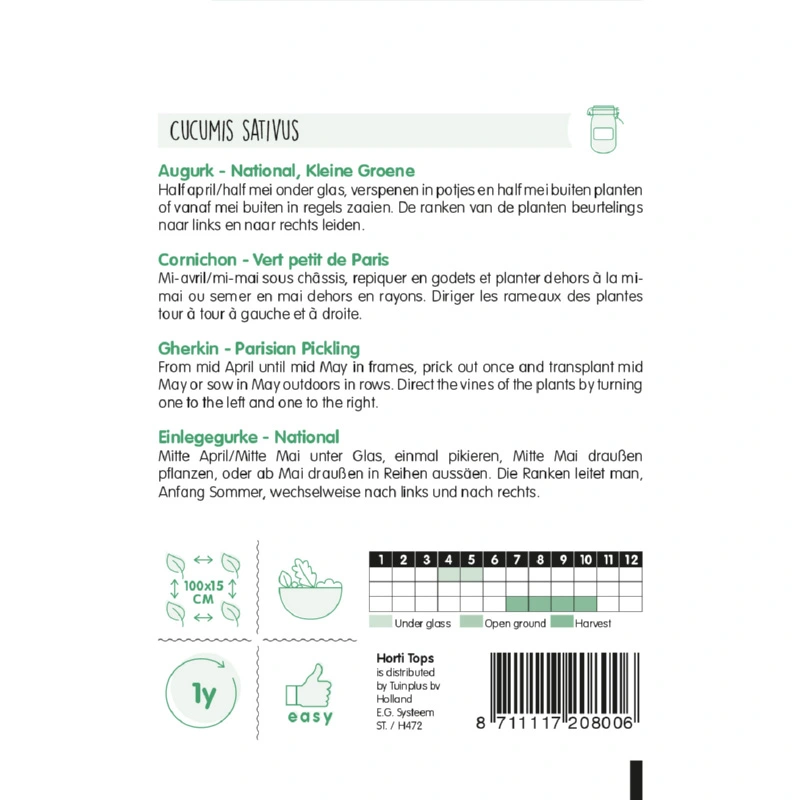 Horti Tops Augurk Kleine Groene Scherpe (Cucumis sativus) kan van half april - half mei gezaaid worden onder glas. Vervolgens verspenen in potjes en vanaf mei uitplanten in potjes of de volle grond. Zaaien in regels in de volle grond kan ook van half mei - half juni. Augurken zijn gevoelig voor wind, daarom op een goed beschutte én zonnige plaats zetten. Oogsten kan van half juni - september.