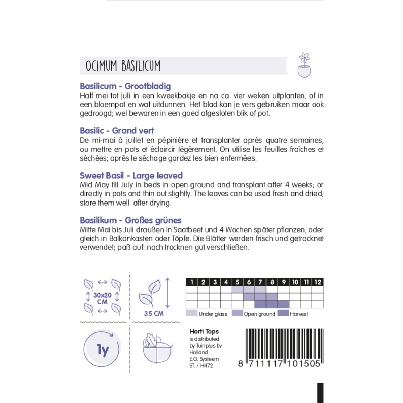Horti Tops Basilicum Grove (Ocimum basilicum) heeft mooie grote bladeren. Het blad van deze basilicumsoort kan zowel vers als gedroogd gegeten worden. Zaaien van half mei - juli in een kweekbakje op een warme plaats en na circa 4 weken uitplanten in een pot. Oogsten kan na ongeveer 2 maanden.