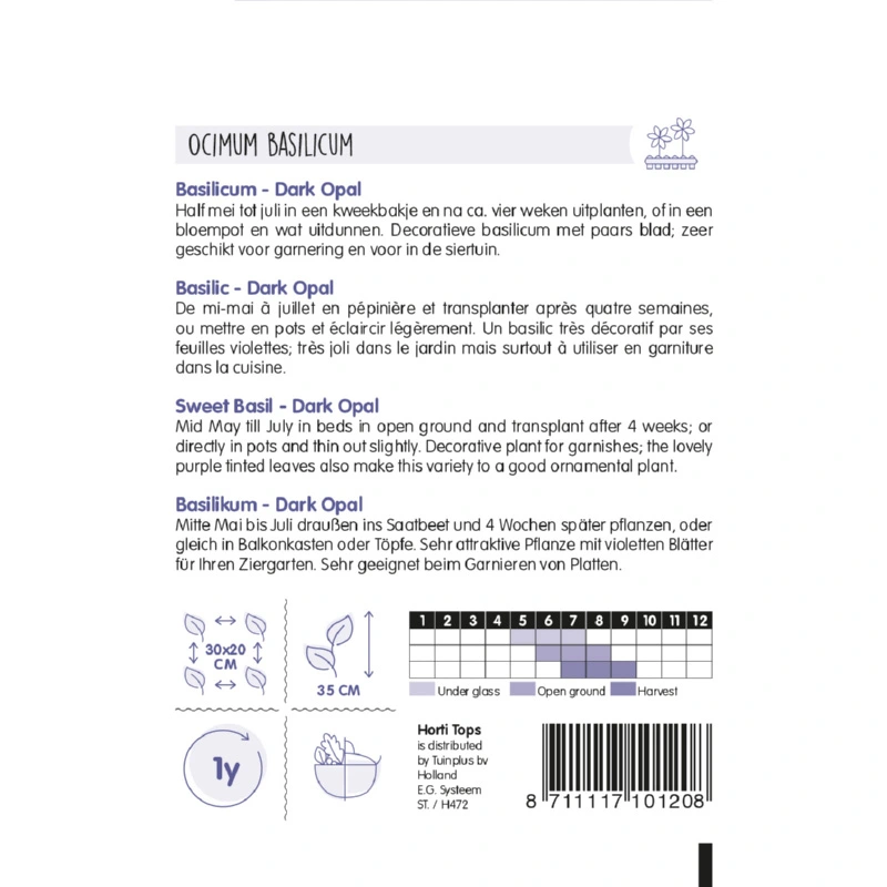 Horti Tops Basilicum Dark Opal (Ocimum basilicum purpurascens) heeft een prachtige donkerpaarse kleur. Deze basilicumsoort heeft een pittige smaak. Zaaien van half mei - juli in een kweekbakje op een warme plaats en na circa 4 weken uitplanten in een pot. Oogsten kan na ongeveer 2 maanden.