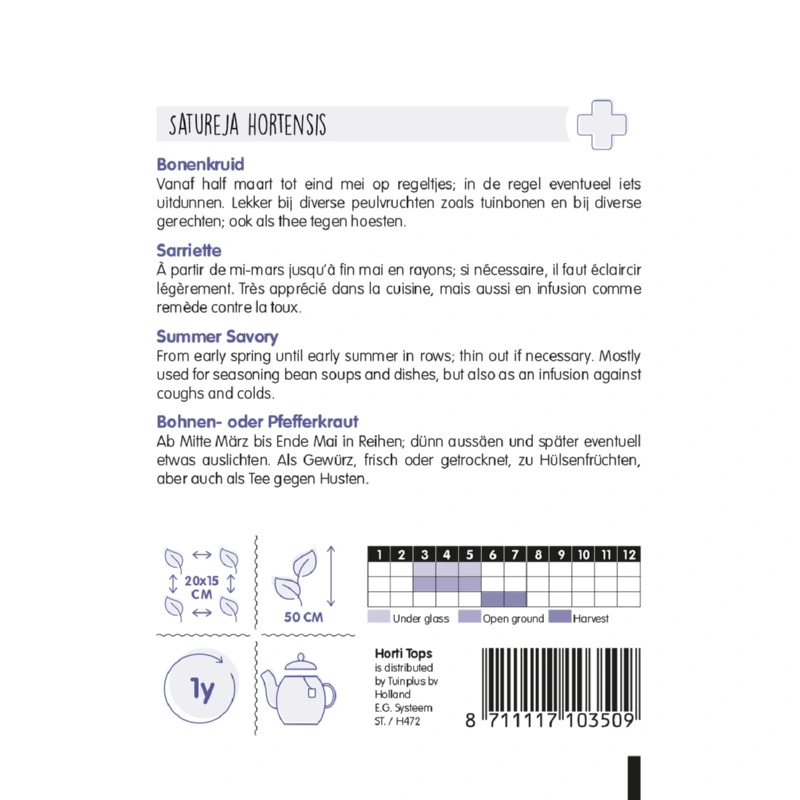 Horti Tops Bonenkruid Eenjarig (Satureja Hortensis) is een kruid dat gebruikt wordt als smaakmaker in gerechten. Met name is bonenkruid geschikt om gerechten met bonen en peulvruchten smaak te geven. Bonenkruid geeft een pittige, peperachtige smaak aan gerechten. De eenjarige variant zoals deze is milder van smaak dan meerjarig bonenkruid.