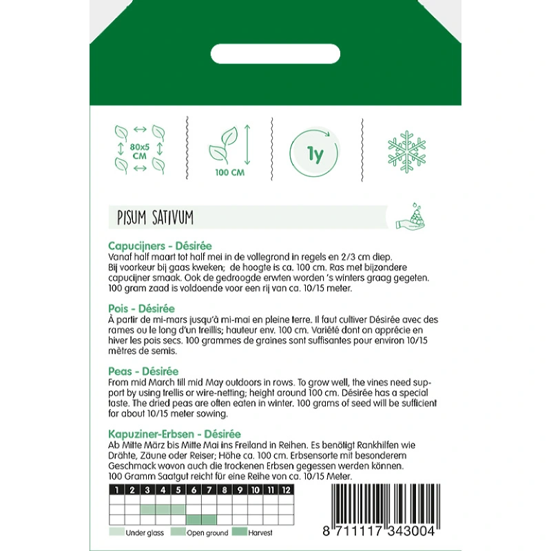 Horti Tops Capucijners Desiree (Pisum Sativum) is een kapucijnersoort met blauw/paarse peulen. Dit ras is sterk rankend en kan daarom het beste bij gaas opgekweekt worden. De erwten van deze plant kunnen zowel vers als gedroogd gegeten worden en hebben een bijzondere kapucijner smaak.