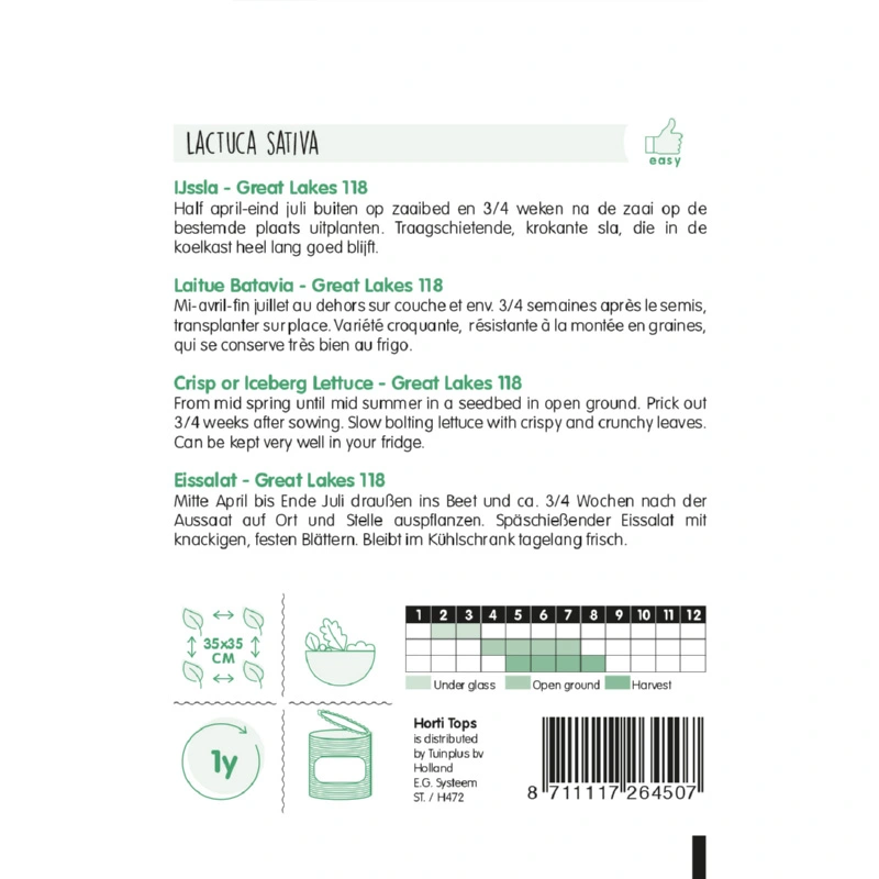 Horti Tops IJssla Great Lakes (Lactuca Sativa) is stevige, krokante sla met een prachtige groene kleur. De sla is lang houdbaar in de koelkast. Zaaien van half april - eind juli buiten op een zaaibed. Ongeveer 3-4 weken na het zaaien, uitplanten in de volle grond.