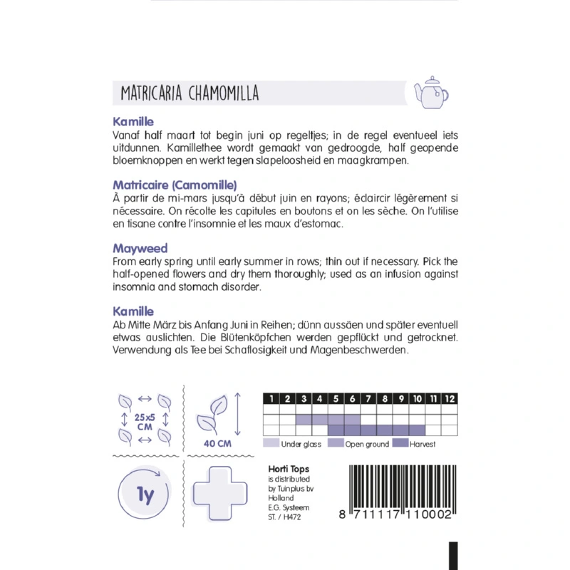 Horti Tops Kamille (Matricaria Chamomilla) kan o.a.gebruikt worden voor het maken van kamillethee, goed tegen slapeloosheid en maagkrampen. Zaaien van half maart - begin juni op regels.