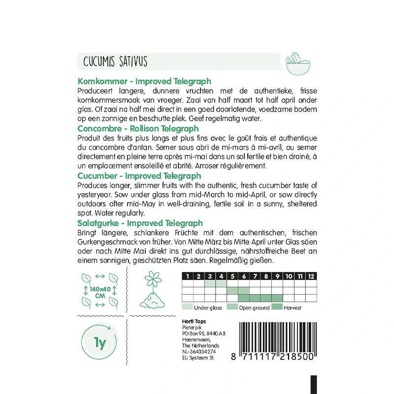 Produceert langere, dunnere vruchten met de authentieke, frisse komkommersmaak van vroeger. Zaai van half maart tot half april onder glas. Of zaai na half mei direct in een goed doorlatende, voedzame bodem op een zonnige en beschutte plek. Geef regelmatig water.
