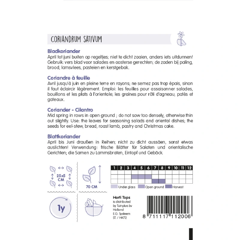 Horti Tops Bladkoriander (Coriandrum Sativum) kan gebruikt worden als smaakmaker in diverse gerechten. Zowel het blad als de zaden kunnen gebruikt worden. Korianderblad wordt veel in Oosterse gerechten gebruikt en de (rijpe) zaden kunnen o.a. gebruikt worden bij brood en lamsvlees.