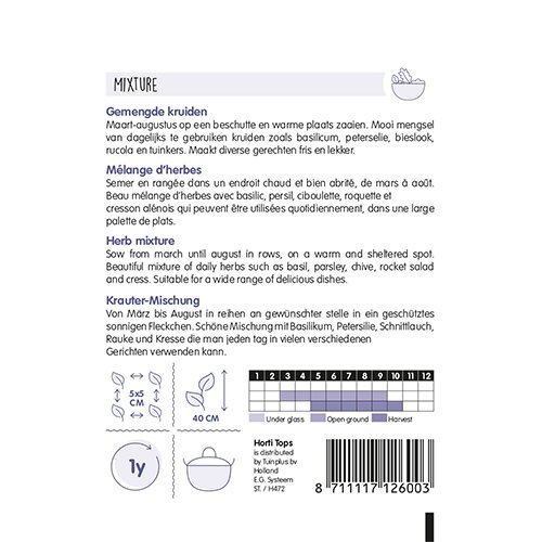Maart-augustus op een beschutte en warme plaats zaaien. Mooi mengsel van dagelijks te gebruiken kruiden zoals basilicum, peterselie, bieslook, rucola en tuinkers. Maakt diverse gerechten fris en lekker.