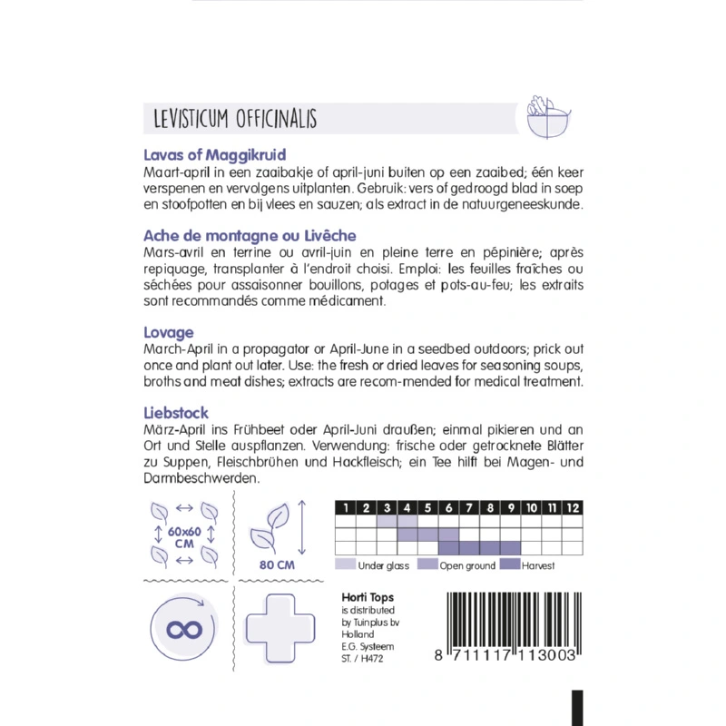 Horti Tops Lavas (maggiplant) (Levisticum officinalis) kan vers of gedroogd gebruiikt worden als smaakmaker in o.a. soepen, sauzen en vlees. Lavas heeft een selderijachtige smaak. Zaaien maart -april in een zaaibakje of april - juni buiten op een zaaibed. Eenmalig verspenen en vervolgens uitplanten.