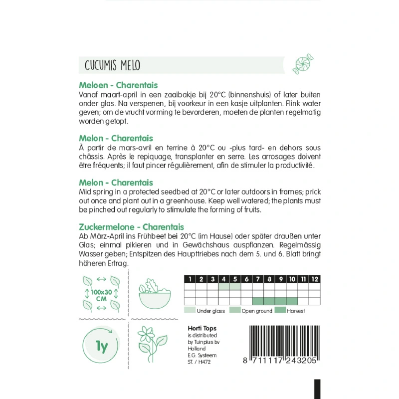 Horti Tops Meloenen Cantaloupe charentais (Cucumis Melo) is een meloensoort met een zeer zoete smaak en aroma. Het vruchtvlees heeft een fel oranje kleur en de schil heeft een lichtgroene kleur, met donkergroene strepen. Omdat meloenen warmte nodig hebben is het verstandig om deze te telen in een kas, onder glas of in een plastic tunnel. Zaaien van maart - april in een zaaibakje bij een temperatuur van 20°C of later buiten onder glas.