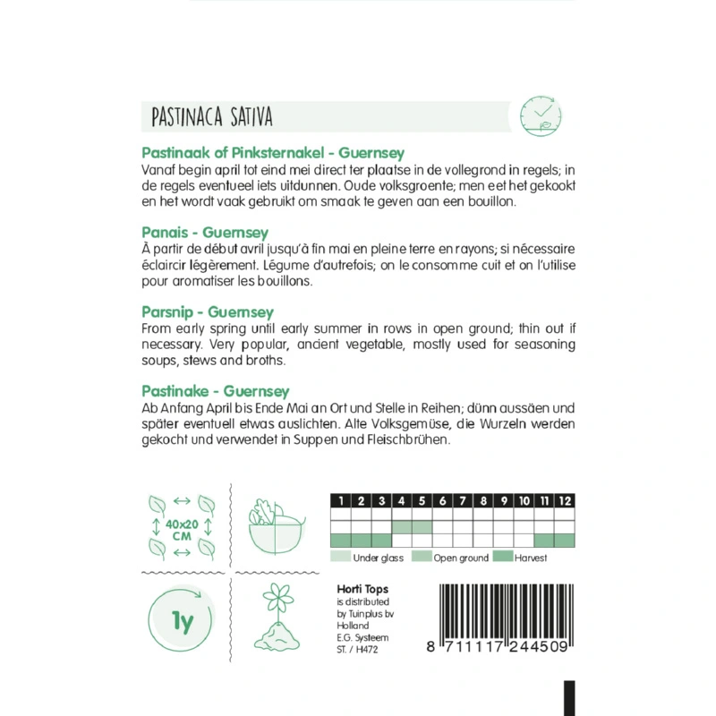 Horti Tops Pastinaak Guernsey (Pastinaca Sativa) is een oude volksgroente en wordt ook wel Pinksternakel genoemd. Pastinaak kan gekookt gegeten worden en wordt ook veel gebruikt om smaak te geven aan bouillon.