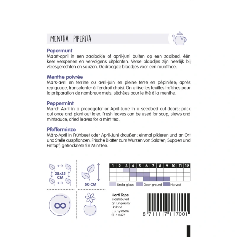Horti Tops Pepermunt (Mentha Piperita) kan op verschillende manieren gebruikt worden als smaakmaker. Verse blaadjes kunnen o.a. verwerkt worden in vleesgerechten en sauzen. Gedroogde blaadjes kunnen gebruikt worden voor muntthee. Dit is een winterharde, overblijvende plant.