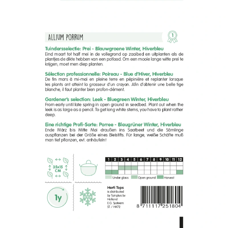 Horti Tops Blauwgroene winterprei (Allium porrum) kan gezaaid worden van eind maart - half mei op een zaaibed in de volle grond. Wanneer de planten een dikte hebben van een potlood dan kunnen deze uitgeplant worden.