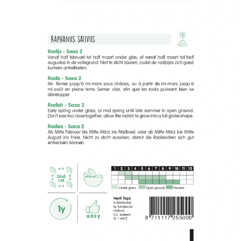 Horti Tops Radijs Saxa 2 (Raphanus Sativus) is een bekende radijs soort met een zachte smaak. Zaaien van half februari - half maart onder glas of van half maart - half augustus in de volle grond.