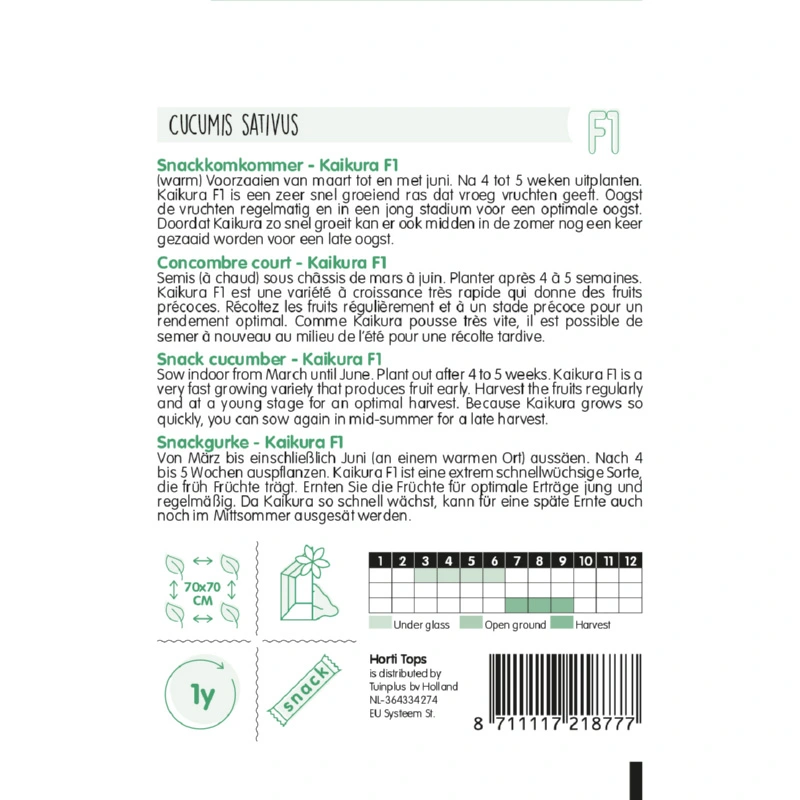 Voorzaaien van maart tot en met juni. Na 4 tot 5 weken uitplanten. Kaikura F1 is een zeer snel groeiend ras dat vroeg vruchten geeft. Oogst de vruchten regelmatig en in een jong stadium voor een optimale oogst. Doordat Kaikura zo snel groeit kan er ook midden in de zomer nog een keer gezaaid worden voor een late oogst.