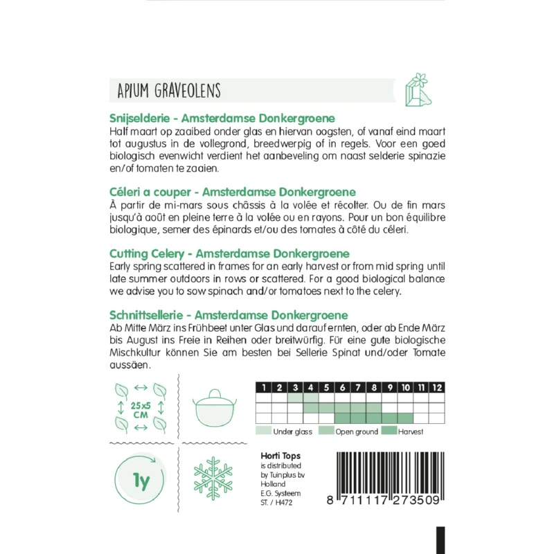 Horti Tops Snijselderij Amsterdamse (Apium Graveolens) heeft kleine, donkergroene blaadjes. Snijselderij kan goed gebruikt worden als smaakmaker in o.a. sauzen en soepen maar kan ook als groente gegeten worden.