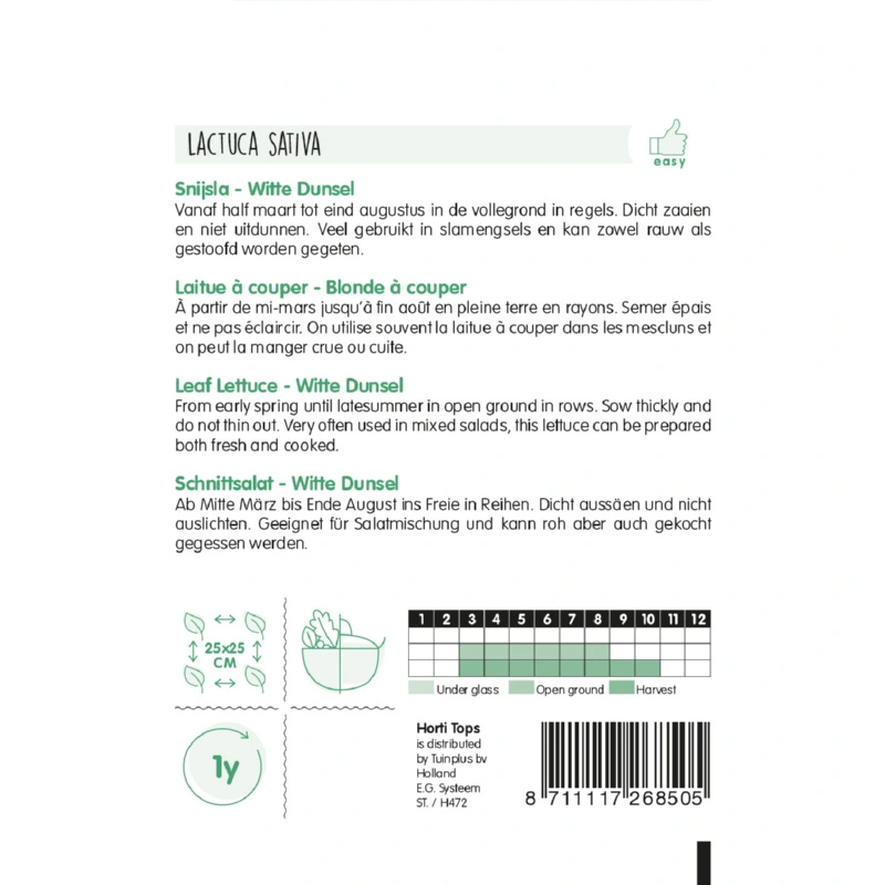 Horti Tops Snijsla Witte Dunsel (Lactuca sativa) heeft lekkere malse blaadjes, kan zowel rauw als gestoofd gegeten worden en is sneller te oogsten dan veel andere slasoorten. Deze slasoort kan vroeg in het jaar binnen worden gezaaid en later in het jaar ook buiten in de volle grond.