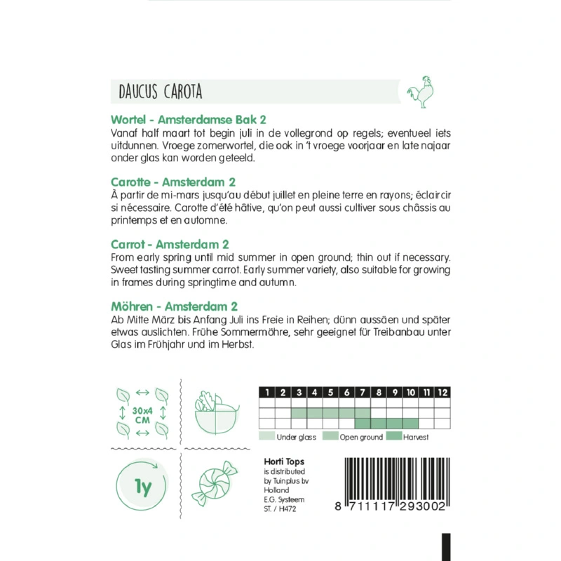 Horti Tops Wortel Amsterdam 2 (Daucus Carota) is een zomerwortel. De wortelen hebben een prachtige oranje kleur en een lange, slanke vorm. Deze wortelsoort groeit goed en heeft een sappige smaak. Zaaien: van half maart - begin juli in de volle grond in regels. Eventueel iets uitdunnen in de regels. Deze wortelsoort kan ook in het vroege voorjaar en late najaar gezaaid worden onder glas