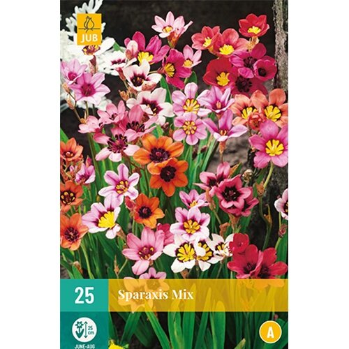 Sparaxis mix bestaat uit een mengsel van vrolijk gekleurde bloemen met een geel hart.