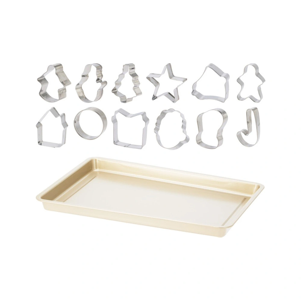 Bak deze feestperiode de heerlijkste lekkernijen met de Kerst Bakset Xmas Design - 13-delig! Deze complete kerst bakset bestaat uit een bakplaat (41×28 cm) en 12 roestvrijstalen uitsteekvormpjes in feestelijke vormen. De bakset is PFAS-vrij en heeft een non-stick bakplaat, zodat koekjes makkelijk loskomen en je snel schoonmaakt. Ideaal voor samen bakken met kids of als cadeau voor thuisbakkers.