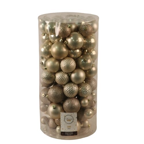 Een verpakking bevat 100 kerstballen van verschillende formaten en een mix van glanzend, mat en glitter. De kerstballen worden geleverd inclusief draadlint waaraan de ballen opgehangen kunnen worden.