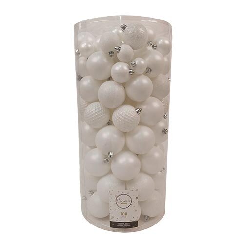 De Kerstballen Mix 100 st. - Winterwit van Buitengewoon Boet bestaat uit een mix van 100 verschillende kerstballen in de kleur: wit.
